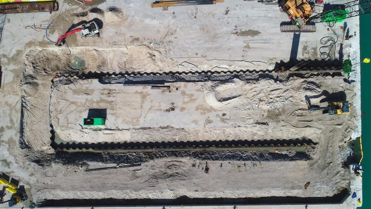 Designing the haul-out basin inside of an existing pier proved to be challenging due to existing foundations from a prior refrigeration building, adjacent bulkhead anchoring systems, and variable soil conditions. It required creativity from the Bennco Engineering team as limited information was available on the bulkheads, the oldest of which is estimated at 100 years. The team performed multiple exploratory excavations to confirm conditions prior, and ultimately a supplementary anchoring system for the new and existing bulkheads was implemented. In addition, Bennco Engineering is providing an active construction support role to rapidly evaluate and address field conditions as they may arise.