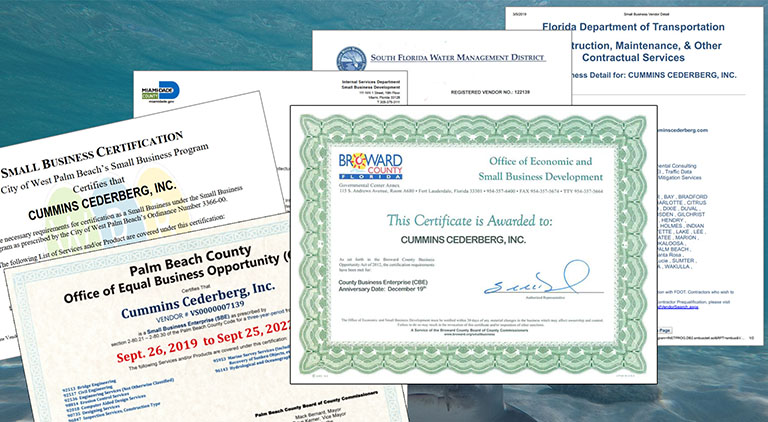 Bennco Engineering holds CBE and SBE certifications for Miami-Dade County, South Florida Water Management District, Florida Department of Transportation, City of West Palm Beach, Palm Beach County, and Broward County.