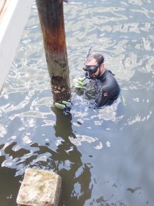 JT: We were performing a scour inspection survey for the Fisher Island Ferry slips. Matt and I were diving, Zach was captaining the boat and Liz was providing support. We were halfway through the dive and completely unknown to us the barge had to be moved. So, Liz jumped in the water and tried to get our attention. I looked up and thought “who is this crazy tourist girl swimming in this ferry slip at Fisher Island?” – I didn’t realize it was Liz until I surfaced!